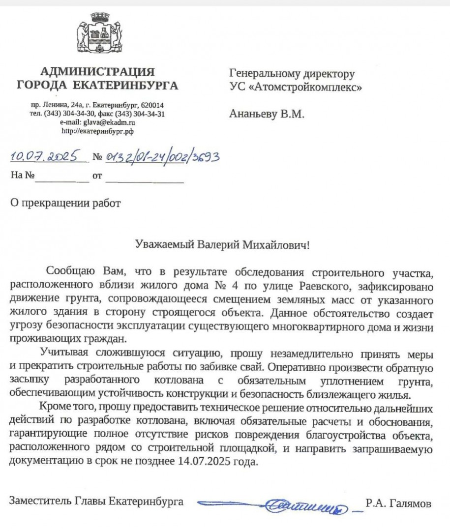 Мэрия потребовала у «Атомстройкомплекса» остановить опасную стройку в Екатеринбурге