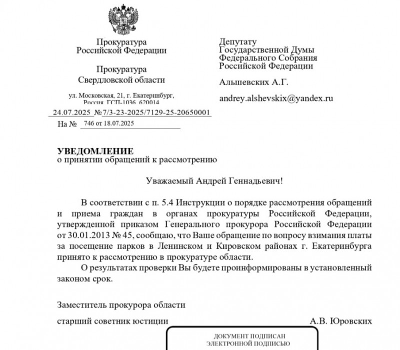 Прокуратура Свердловской области оценит законность введения платы за активности в дендропарках Екатеринбурга, следует из ответа зампрокурора Свердловской области Александра Юровских депутату Госдумы Андрею Альшевских.