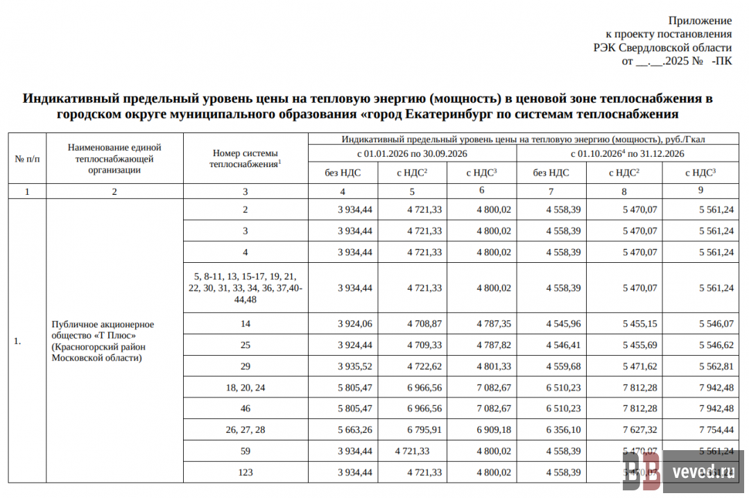 Согласно проекту постановления Региональной энергетической комиссии (РЭК) «Об утверждении индикативного предельного уровня цены на тепловую энергию», для районов, обслуживаемых ПАО «Т Плюс» и входящим в его структуру АО «Екатеринбургская теплосетевая компания», предельная стоимость тепла с 1 января 2026 года вырастет с 4 721 рубля 33 копеек за Гкал до 5 470 рублей 7 копеек. А поскольку федеральные власти со следующего года планируют ещё и увеличить НДС (с 20% до 22%), в проекте заложили стоимость с учётом увеличенной ставки налога на добавленную стоимость — 5561 рубль 24 копейки.