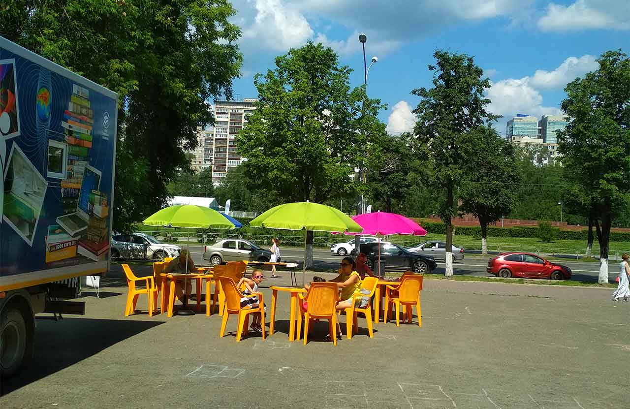 Летний читальный зал перед «Горьковкой» работает с понедельника по четверг с 12 до 17 часов. Он открылся 25 июня, и с тех пор в нем уже побывали 2 268 человек.